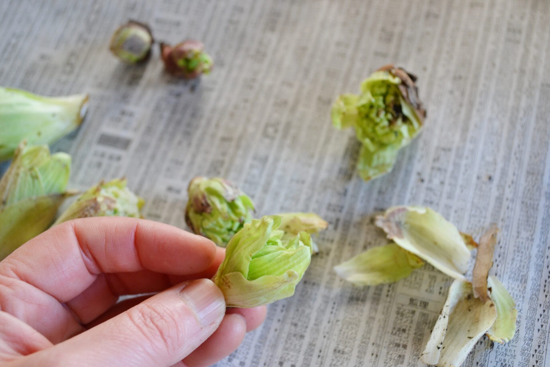 (2)フキノトウを軽く水洗いし、刻みます。