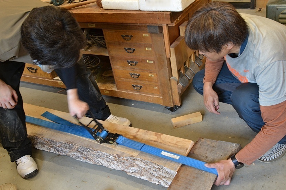 耳付きや曲がったりねじれたりしている材料を使っていることから、構造の全てを手加工で仕上げています。樹種が異なり個性的な板同士を組む際には、材料の特性や大きさを考慮し、場所によって最適な加工方法を選択しています。