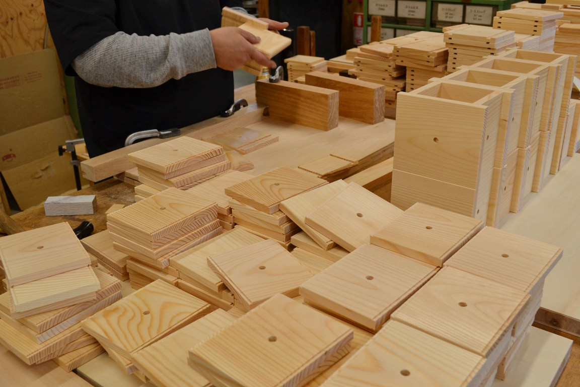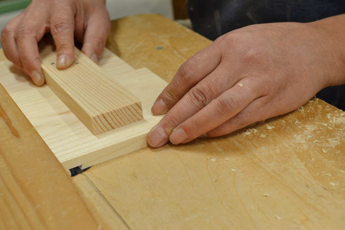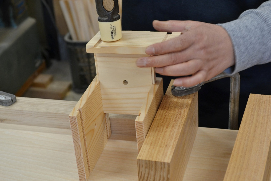 型、底、蓋の全てを蟻継ぎ(ありつぎ)で組んでいます。蟻継ぎとは日本の伝統的な木組み工法。木の動きを読みながら全体的な仕上がりを考え、適した部材を選んでいます。