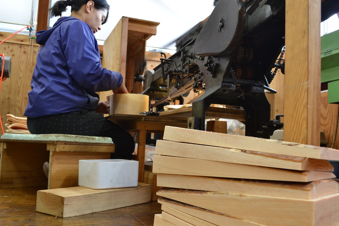 使用した木材は、経木生産の際に出るアカマツの端材。豆乳を炊いたり、油揚げを揚げるかまどの薪として利用下さっているmuiさんが、「豆腐型箱を経木の端材で作れないか」と提案して下さいました。