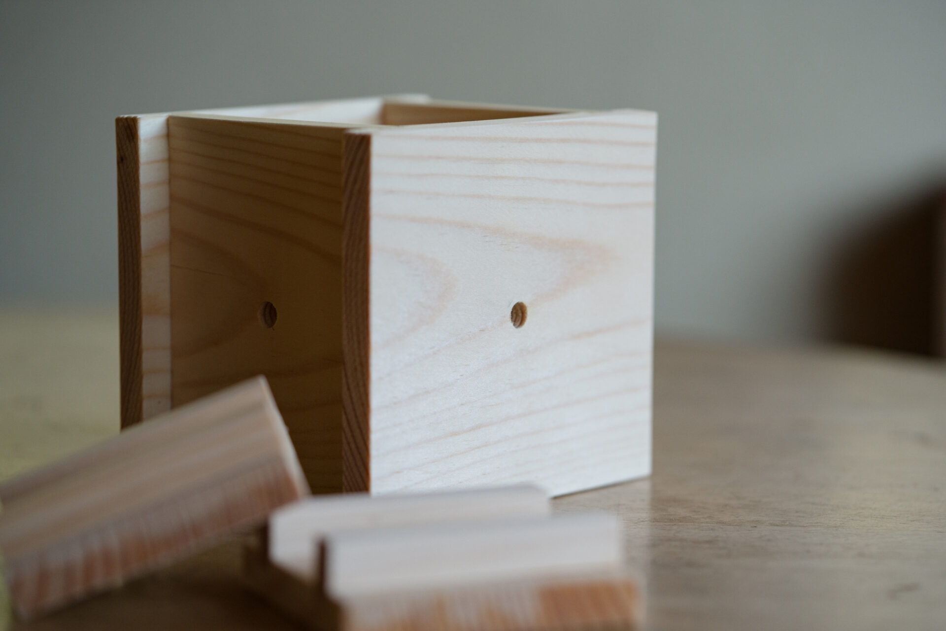 型、底、蓋の全てを蟻継ぎ(ありつぎ)で組んでいます。蟻継ぎとは日本の伝統的な木組み工法。木の動きを読みながら全体的な仕上がりを考え、適した部材を選んでいます。